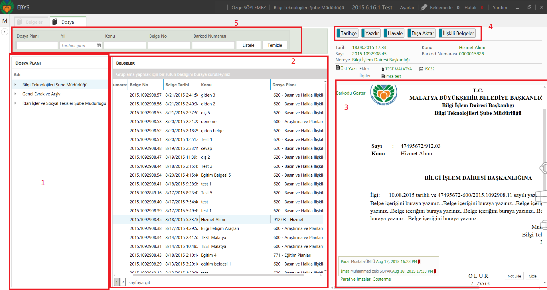 Birim arşivinin üzerinde bulunan arama kısmına kriter girerek belgelere kısa yoldan erişebilirsiniz.( Şekil 32 – 5. Alan )